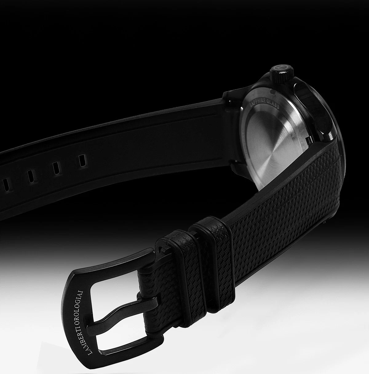 - Cinturino in silicone nautico molto morbido e resistente con fibbia nera in acciaio con rivestimento PVD.
